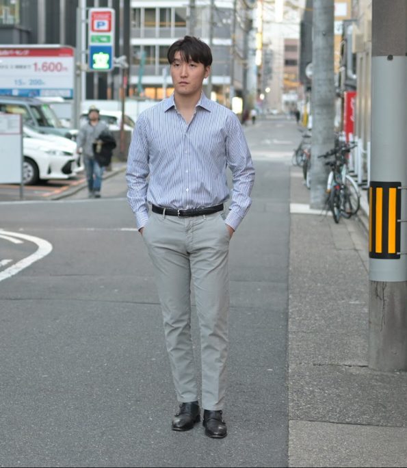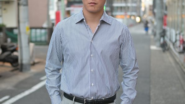 そして白×グレーのロンドンストライプ。ビジネスでも使える柄のシャツで、僕が真っ先にお勧めしたいアイテムです。
