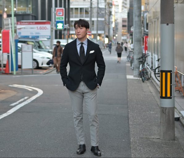 例えばこんな感じで、ブラックジャケットにグレーのパンツ、柄シャツに黒のネクタイを合わせてチーフは白。