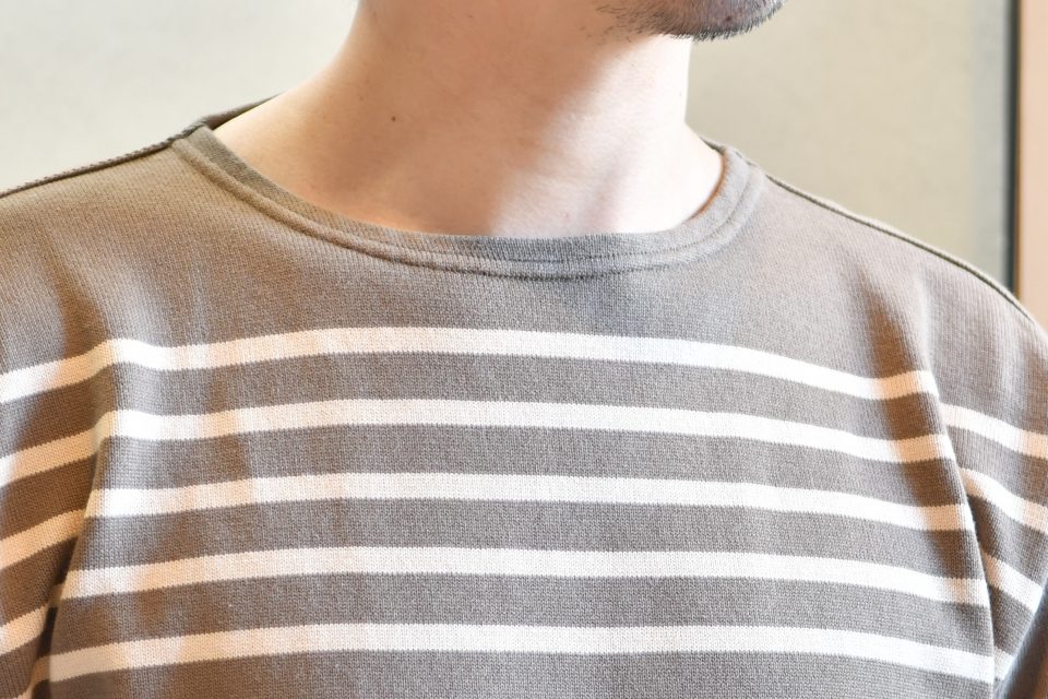 首元はクルーネックなのでお手持ちのアイテムと遜色なく取り入れてもらいやすいかと思います。ただいわゆる普通の丸首よりもほんのり横に広くラウンド部分は緩やかなカーブですので、少しボートネックの香りがする感じもします。そのあたりが他にはない形で好きなのですが。