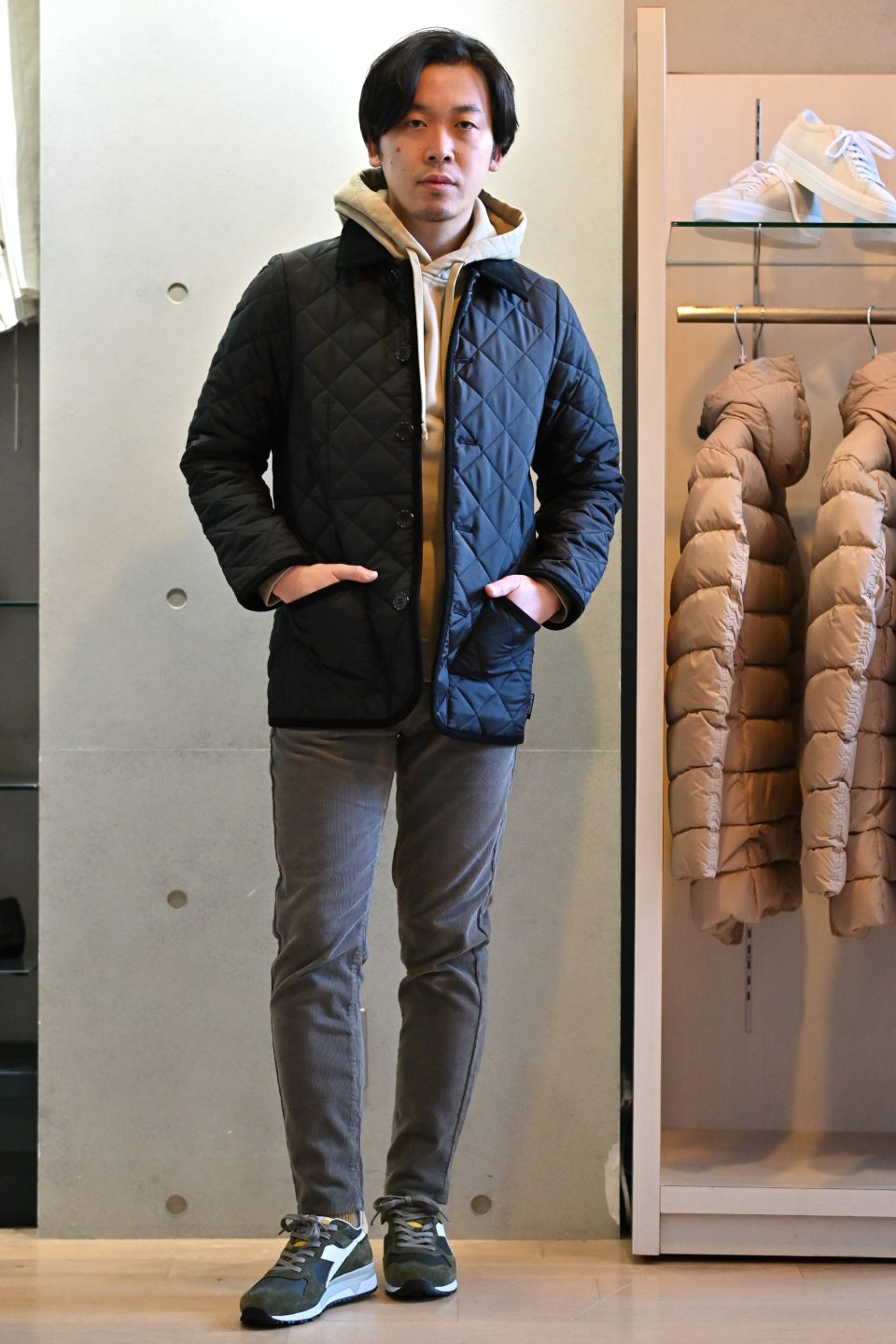 キルティングジャケットは着丈の長さや作りのサイズ感の特徴上、スーツスタイルレベルのONスタイルの上に着用するもあり、パーカーやスウェットなどカジュアルなスタイルもありとかなり用途も幅が広いです。