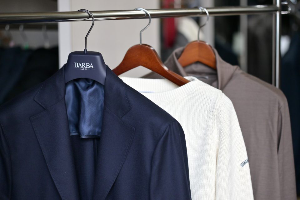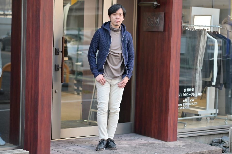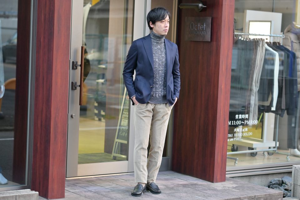 このようにインナー&パンツに季節感を出すだけで十分バルバのジャケットは両方のコーディネートにすっぽりと収まります!ウール100%の質感だけを言えば、ジャケパンでビジネススタイルさえ作れるので、ONもOFFも冬も春もと自由自在に着回しできるまさに万能な一着と言えますね!個人的にも愛用している一着ですので、サイズ感や着心地など詳細はLINEでも気軽にお問合せください。