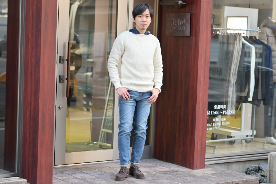 「素材やアイテムとしてシーズン広く着れるのは分かったけど、いったいどうやってコーディネートするのか」ということで、こちらも同じカネルのコットンニットを使って[冬コーデ]と[春コーデ]のパターンをご紹介します。