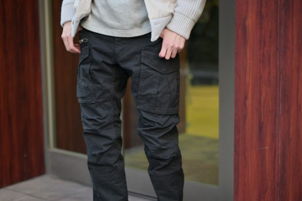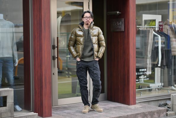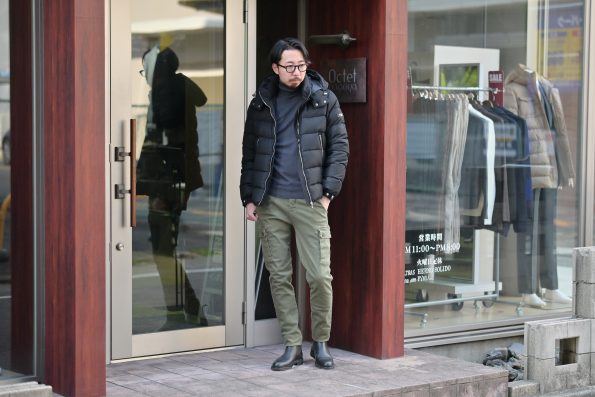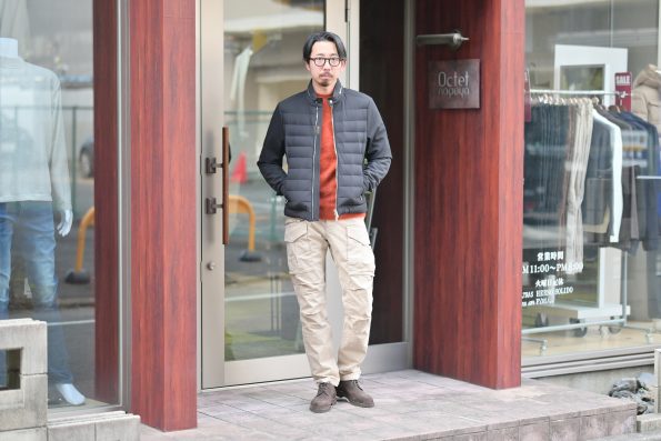 こちらも一つ前と同じ黒のカーゴパンツを使ったコーディネート。黒はカーキとの相性が非常に良いです。ミリタリー要素のあるカーゴパンツはカーキのイメージもありますし特にですね。ワークパンツにワークブーツを合わせてキャンプなどとアウトドアシーンにもピッタリ合うコーディネートにしてみました。ヘルノのダウンやリプレイのニットはスッキリしているので野暮ったくならず都会的なミリタリーコーディネートになってますね。