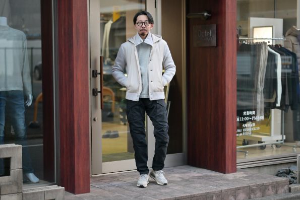 さて続いてはベージュのカーゴパンツの着こなしですね。先程のカーキのカーゴパンツよりも若干シルエットはゆったりしてます。これぞカーゴパンツといった感じ。ワーク感がしっかりあるので上にはニットやショート目のダウンを合わせてスッキリさせバランスを取ってます。このカーゴのような土臭さが好きな人には堪らないはずです!