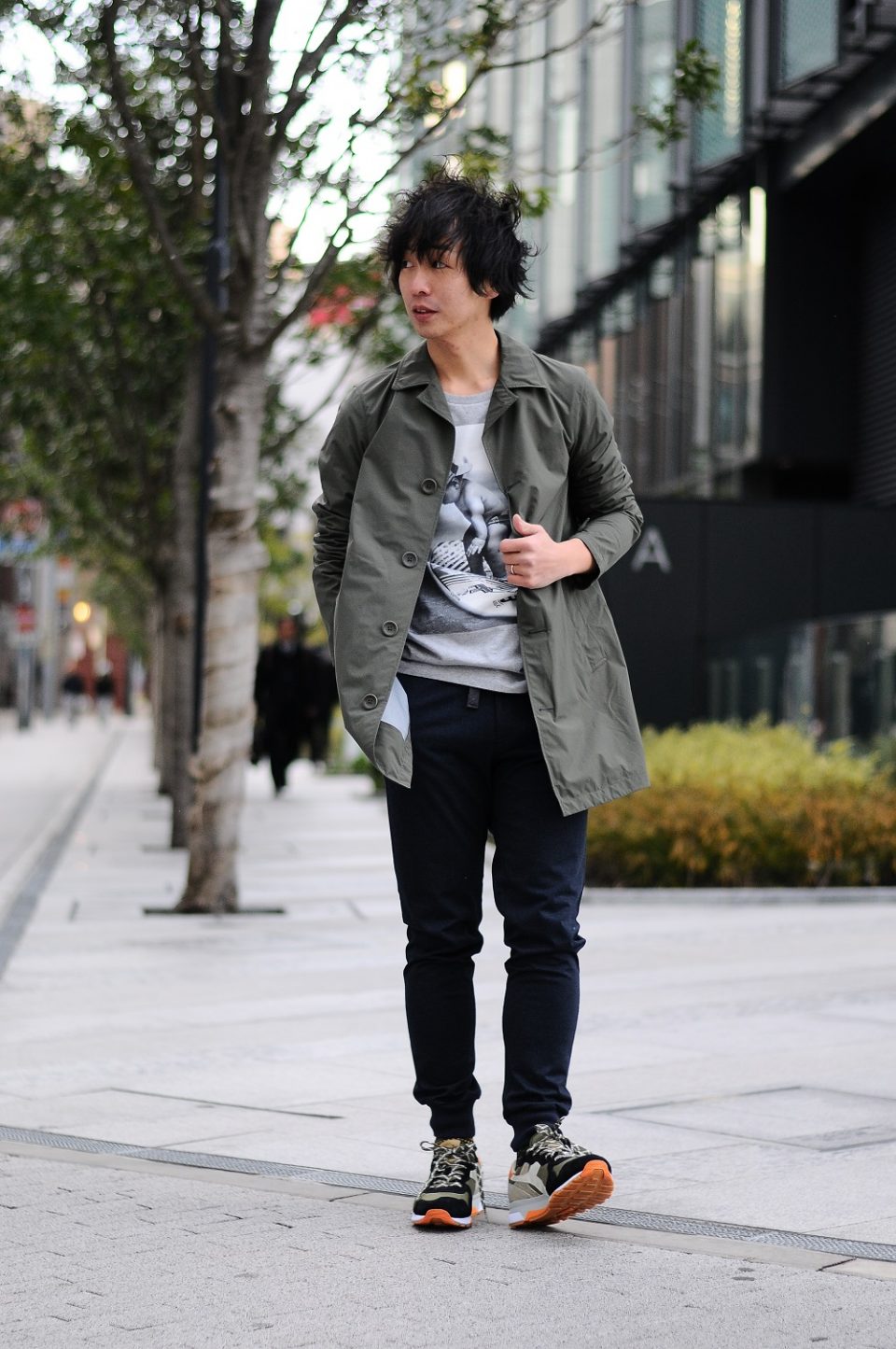 スニーカーのソールのオレンジとコートのカーキの〝カラーバランス〟