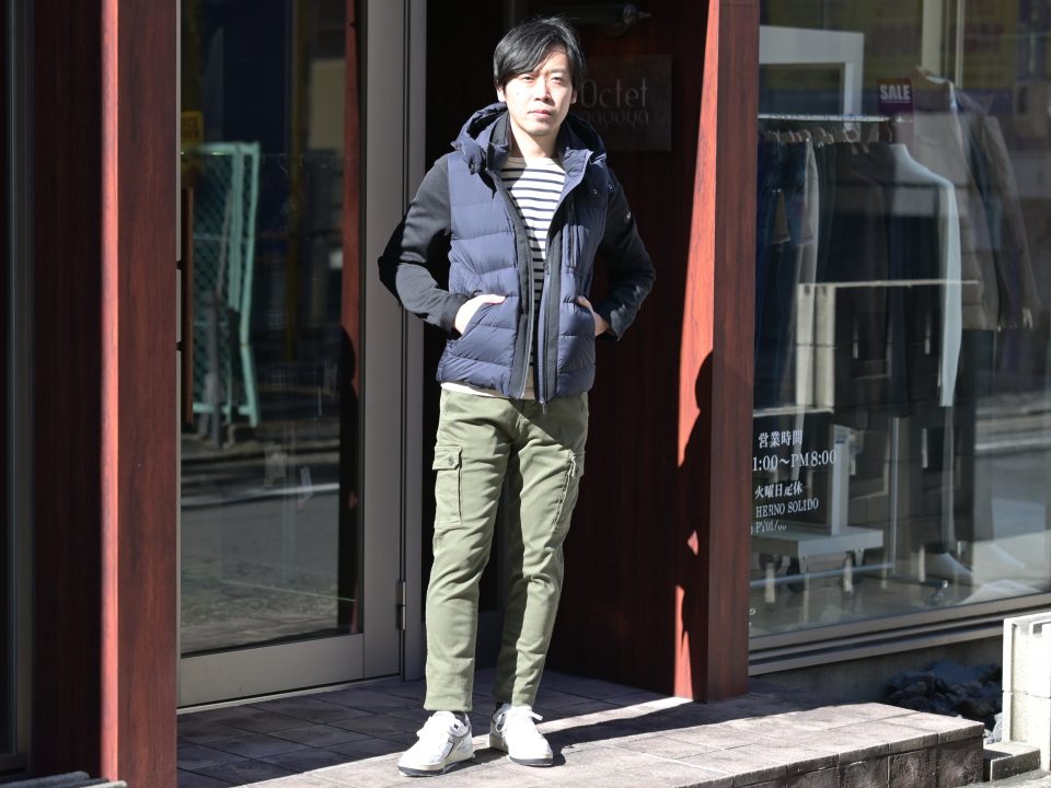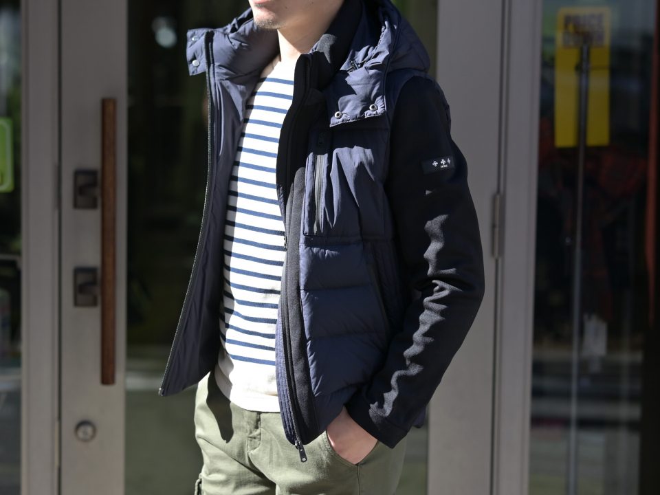 タトラスのラグスポな雰囲気ならインナーもモノトーンやスポーティーな素材のアイテムにするのが王道かと思いますが、パパとして気取りすぎず柔らかなイメージに仕上げるために爽やかなマリンボーダーをチョイス。パンツ選びもブラックデニムやスウェットとモノトーンにおさめずミリタリーでカジュアルダウンですが、シルエットは抜群にキレイなリプレイのハイパーフレックスシリーズですので野暮さは皆無ですね。