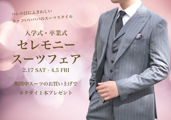 今回は、2/17(土)から3/31(日)まで開催する、『セレモニーフェア』の詳細や、特典、オススメのスーツのコーディネートをご紹介しました。