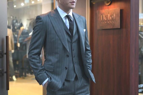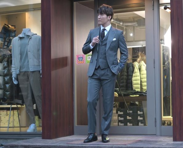 続いては、グレーのストライプのスリーピーススーツのコーディネートをご紹介します。ベスト付のスリーピーススーツは全体的に華やかさ貫禄をプラスしてくれますので、式典にはピッタリですね。