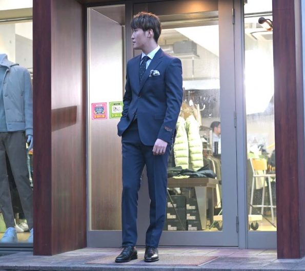 まずは、ビジネスシーンでも着用可能なスーツでお持ちの方も多いと思う、ネイビーの無地スーツを使ったシンプルなコーディネートになります。