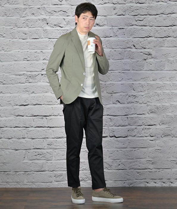 ジャケットと同系色のカーキを足元に合わせ色物も統一感のあるスタリングになっております。