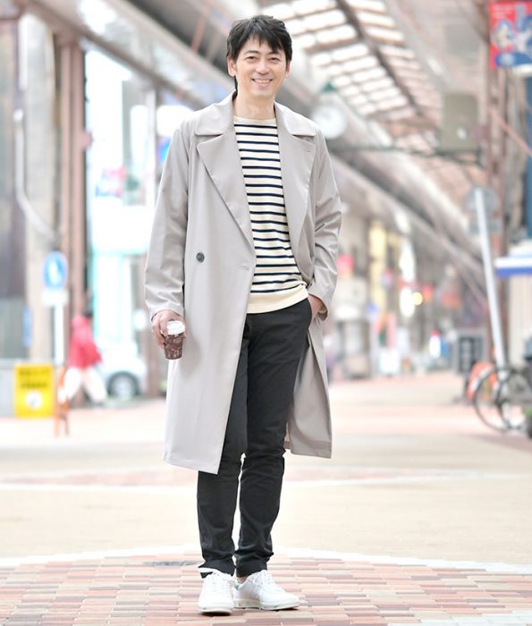 綺麗めなアイテムであるコートでも足元はアクティブにスニーカーを合わせるのもありですね。