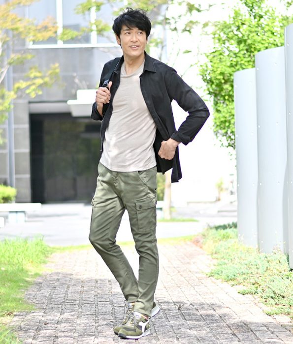 ミリタリースタイルの代表格カーゴパンツとシャツを組み合わせたコーディネートになります。