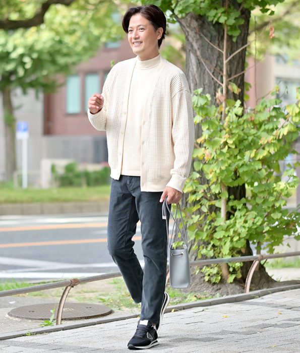 パンツとシューズを同系色に合わせることで脚長効果も狙えますよ。
