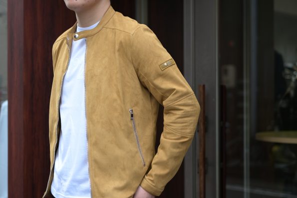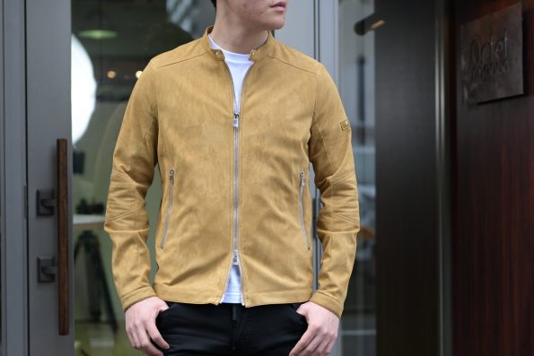厚い革を使った本気のバイカー仕様ではなく、薄手で、フェイクスウェードなので、軽く、上品でしなやかな艶があります。