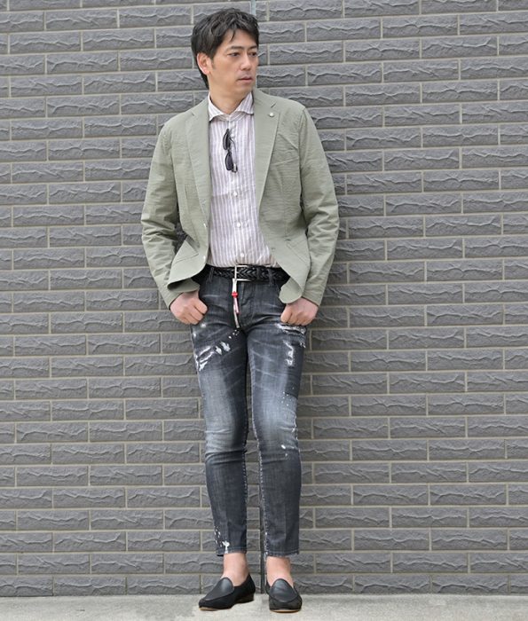 また、パンツは、ダメージのあるヤンチャな遊び心のあるアイテムで男らしさを感じますね。