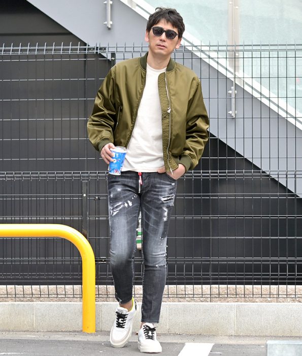 続いては、オリーブカラーのMA-1を使ったコーディネートになります。、先程と同様にクラッシュの効いたデニムでカジュアルなスタイリングに仕上げております。