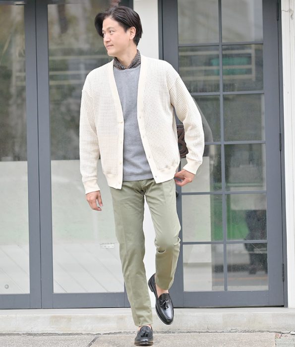 ベージュ系のカーディガンとカーキを合わせたこちらの着こなしは、自然を連想させる、アースカラーの配色となっております。