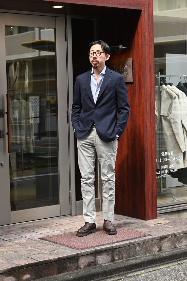 さて早速着てみました。これはシルエットが美しすぎますね。同じネイビーのジャケットでも仕立てが違えば全く違うアイテムに見えますがまさにBOGLIOLIのジャケットは唯一無二というか。エレガントでクラシカルな佇まいは現代のジャケットだとなかなかないです。