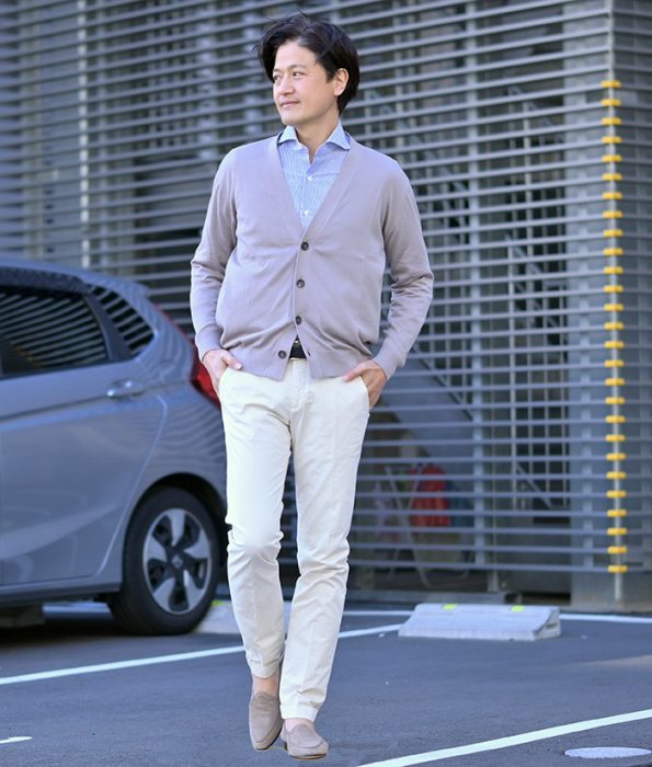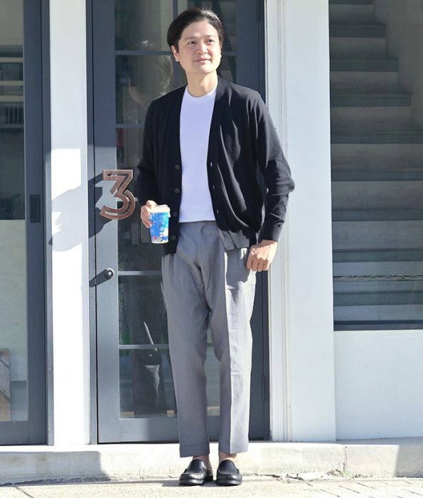 最後はグレージュのカーディガンのご紹介です。今回は、シャツの上からの着こなしになります。フロントのボタンを閉めて着るとまた雰囲気が変わるかと思います。今回のコーディネートに関しては、カジュアルながらも少しカチッと見える着こなし。