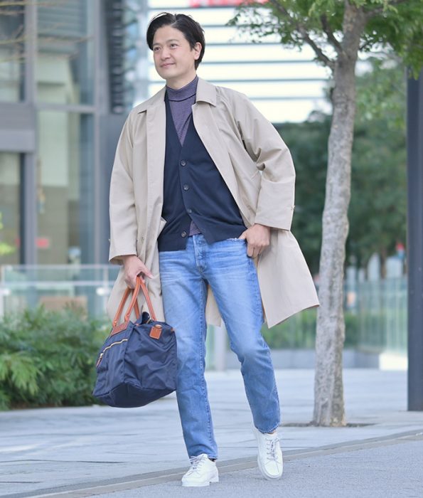 また、移動が多い旅行など車内や室内が多い場合でも脱ぎ剥ぎができますので便利ですね。今回は、春らしく淡い色味のデニムとベージュのコートを合わせ季節感のある着こなしになっております。