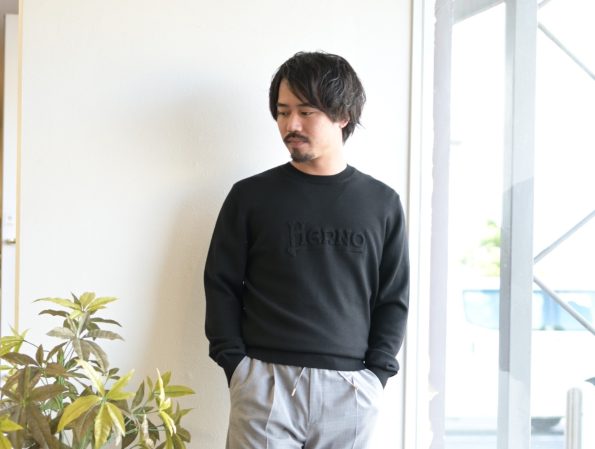 胸に「HERNO」の刺繍ロゴ入りトレーナーです。シンプルな丸首。デザインは今回ご紹介するニットにも近いです。スポーティが得意なヘルノなので、こちらのトレーナーは、毎回入荷してはすぐに完売アイテムです。ただ、ニットになると全然別アイテムです。ニットの素材の柔らかさは、触れてみるとわかります。