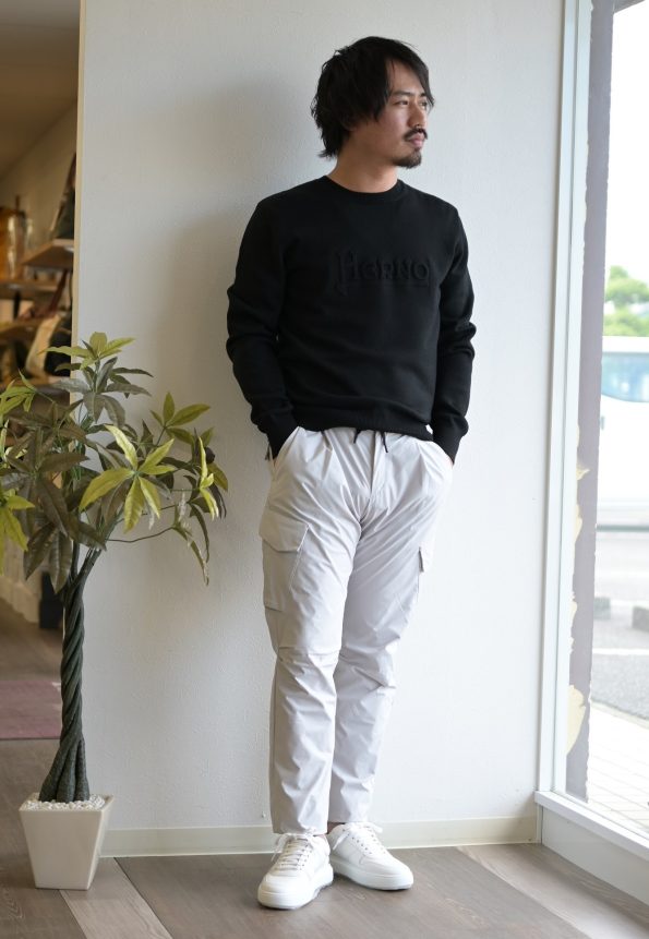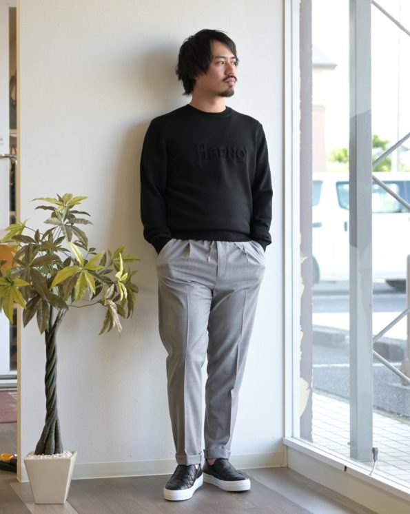 エンボス加工とは、表面に凹凸をつける加工です。こちらのニットにもある、でこぼこした「HERNO」ロゴが一番のポイントです。光が当たるとロゴが微かに浮き出るので、ブランド名もあまり主張しすぎません。でもブラック一色だけだとシンプル過ぎなので、これぐらいが丁度良いデザインです。ブランドのイメージはスポーティですが、ほぼ無地に近いので、スウェットや、ナイロンパンツだけなく、カジュアルなデニムや、コットンパンツ、さらにキレイ目なスラックスとも合わせやすいニットになります。しかも、他のアイテムとも喧嘩しないので、ロゴ入りニットでも、落ち着いたイメージになりますね。