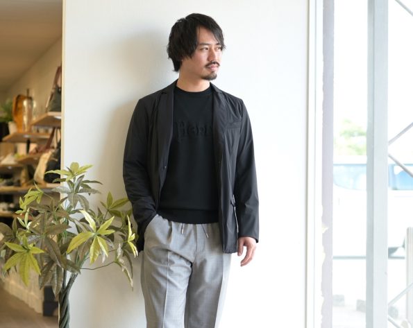 サマーウールのニットなので、上品なスラックスでも実は合います。例えば、ライトグレーのサマーウールのパンツにもピッタリ。ウエストはゴムでリラックスした雰囲気ですが、センターに折り目の入ったキレイ目のパンツに、ブラックニットは引き締め効果も増してカッコいいです。