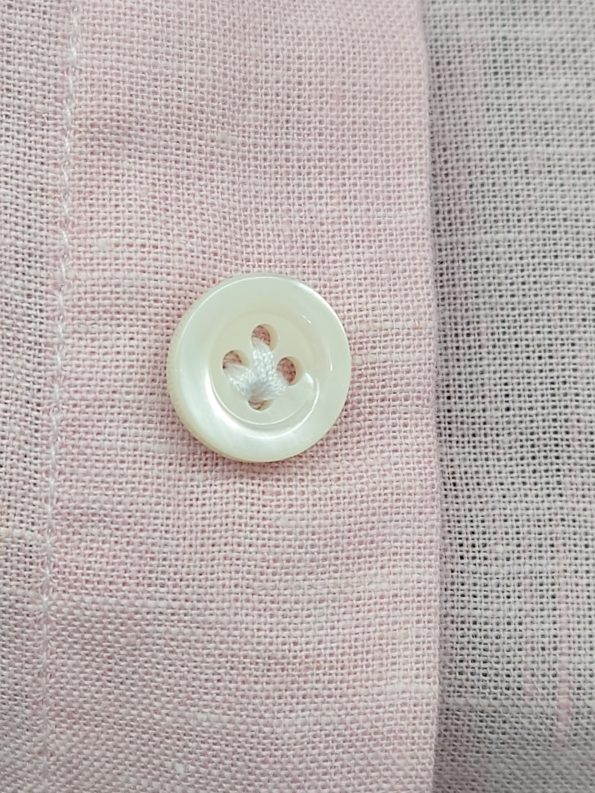 イタリアシャツのボタンの留め方でよく見かけるのが、こちらの鳥足、通称「ザンパテ・グリアート」と言うボタンの留め方です。普通と違って、こうやってボタンを付けると、シャツに対して斜めになるのでボタンを留めたり、かけたりがしやすくなります。ジャンネットの拘りが見え隠れしますね。