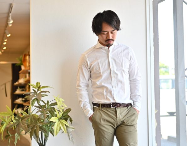 当店でも大人気のシャツブランド「GIANNETTO/ジャネットとFinamore /フィナモレ」のシャツを当店スタッフの大畑君に着てもらいました。
