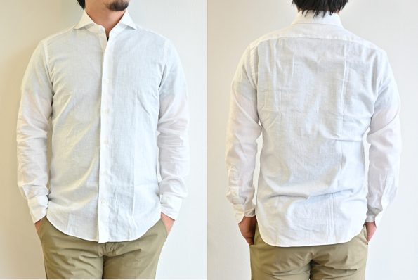 衿の形は「ホリゾンタル」または「カッタウェイ」と言って、襟が大きく開いています。イタリアンシャツでは、よく見かける、後ろに襟の先が反ったタイプです。今ではノータイでも襟のおさまりが良く、ドレスシャツでも人気の襟の形です。普段なら、リネンが混合されると、自然な皺も入って、リゾート感が増しますね。台襟の高さもあるので、縦長効果で、首周りもすっきりと見えます。