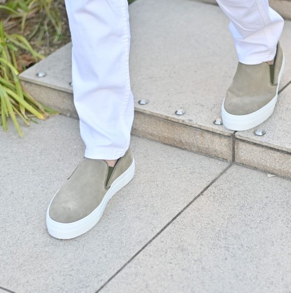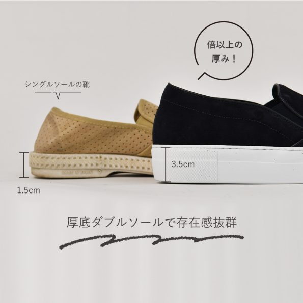 スリッポンとしては厚底の仕様になっております。厚みは、3.5㎝のダブルソール仕様。シングルソールのシューズと比較すると一目瞭然ですね。足元に適度なボリューム感を出せ、脚長効果も抜群です。