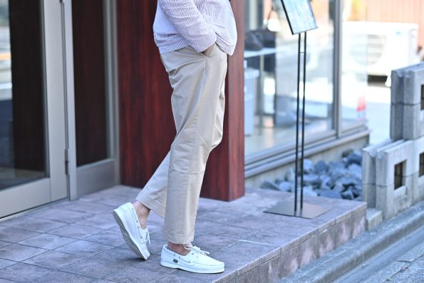 こちらも僕の愛用している表革のバース!スラックスなど少し上品なスタイルの足元に夏の時季は特に活躍させてます。王道の茶系(アメリカン)やブラックも良いですが、さわやかな白もオススメです!スラックスからデニムまで使えるとなるとカジュアルなシーンでは外せない本当に使い回しの効くアイテムで、一回履くとほんとに他の靴が履けなくなるくらい心地良いのでその点だけは唯一注意ですね(笑)
