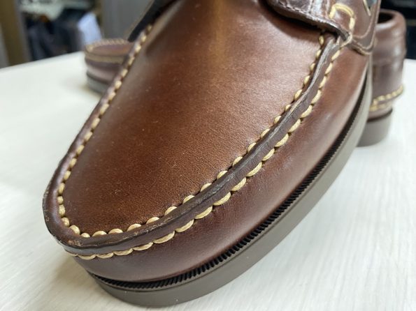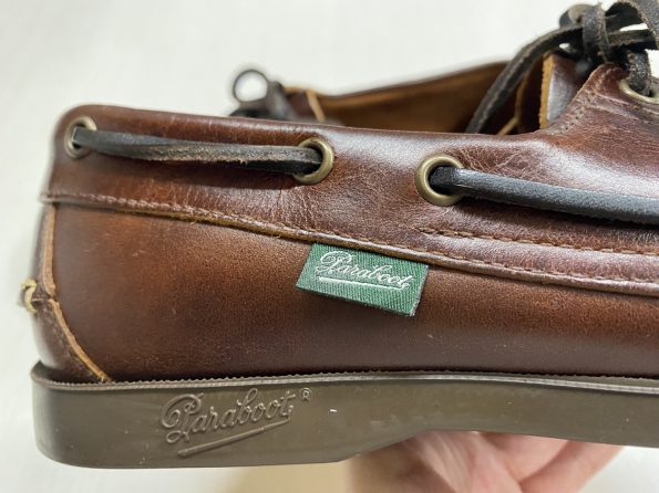 さてパラブーツのシャンボードやミカエルなどの多くのモデルに採用されているノルウェイジャン製法ではなく、素足で履くことを想定(船のデッキだと濡れるため)して、足裏を快適に包むU字のパーツと甲部分のパーツを縫い合わせているブレイク製法を採用しているんです。このブレイク製法によって素足でも快適に包み込めんでくれるんですよ!