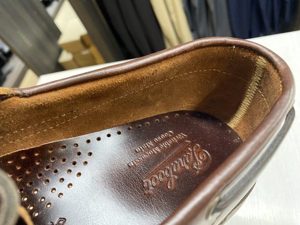 そして特徴的なのは中。通常革靴は耐久性を高めるために革を2、3枚縫い合わせてアッパーとして使いますが、その足に当たる側のライニングレザーを取っ払った”アンラインド仕様”になっています。こうすることで革の質感が直接足に伝わり、革の馴染みも早くなります。バースは特に足当たりが柔らかいため革靴を一から育てるのが大変だといつ方にもオススメです。