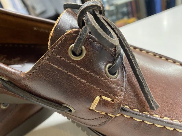 また船の上で水に濡れた際にシューレースが固くなるのを防ぐため敢えてシューレースにレザーを採用しています。脱ぎ履きがしやすい工夫がとても面白いですよね!こういった一見デザインにも見えるディティールにちゃんと意味があるのもデッキシューズの魅力ですね!