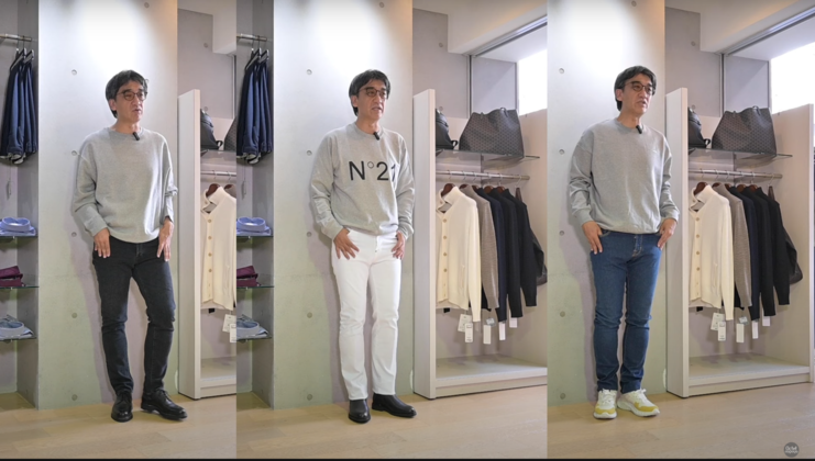 秋冬になってくると、デニムパンツもそこまで暑さを感じることは少なくなると思いますので、ぜひ選んで穿いていただければと思います。今回ご紹介しているデニムは、ラインがそれほど細くはありませんが、すっきりと見えるタイプのものを選んでいます。現在のトレンドでは、裾まで太いストンとしたシルエットのデニムが多くのブランドから紹介されていますが、大人の男性が穿くとコーディネートが難しく、服に着られているような印象になりがちです。そのため、個人的にはあまり太すぎないパンツを選んでいただくことで、よりバランスよく着こなせるのではないかと思います。