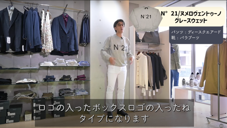 2つ目はN°21/ヌメロヴェントゥーノ のグレーのスウェットで、胸に大きなボックスロゴが入ったタイプになります。シルエットは先ほどのものとは異なり、それほどオーバーサイズではないので、普段通りの感覚で着ていただけると思います。カジュアルに着こなすにはこのようなデザインでもそれほど気にならないでしょうし、大きな胸ロゴのものを選んでも十分格好いいと思います。