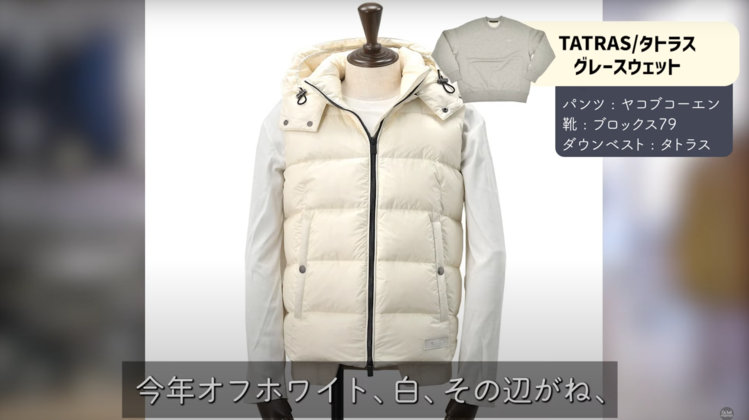 こんな感じでダウンベストを羽織ってみましたが、私はこのトレーナーが秋のシーズンを通して主役として使えると思っています。ただ、真冬の本当に寒い時期には少し厳しいかもしれません。ダウンの色についてですが、個人的には今年はオフホワイトや白がいいと思っています。何か一つだけアイテムを買うとしたら、こういった明るめのアウター、特にダウンベストを選んでいただくのも、僕は格好いいんじゃないかなというふうに思っています。