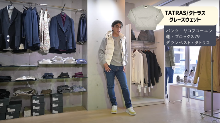 3つ目のコーディネートですが、今回はTATRAS/タトラス のスウェットを選ばせていただきました。こちらはタトラスの胸ロゴとアイコンが付いているシンプルなデザインです。こういった杢のグレーのトレーナーは非常にベーシックなアイテムではないかと思いますが、ぱっと見では同じに見える杢のグレーでも、デザインやシルエットの違いに加えて、裏の仕上げがパイルになっていたり、裏が起毛になっていたりと、細かな違いがあります。同じ杢のスウェットでも、そうした違いによって印象がだいぶ変わるのではないかと感じています。