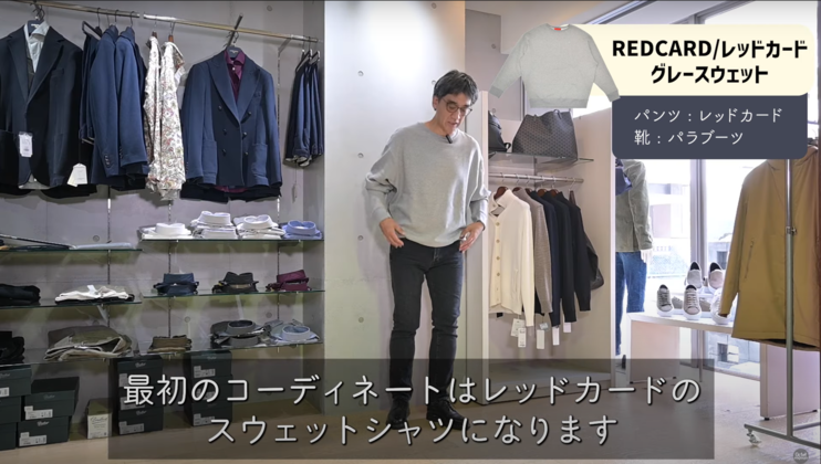 最初のコーディネートはRED CARD/レッドカード のグレーのスウェットシャツです。こんな感じで、少しオーバーサイズ気味で今風のシルエットになっているので、サイズに気をつけて選んでいただければ、とても格好いいんじゃないかなと思っています。まだオーバーサイズ気味の服を40代、50代の大人の男性が着るには、パンツは少し細身のものを合わせていただくと、スマートなシルエットが作れると思います。いわゆるYシルエットという感じですね。