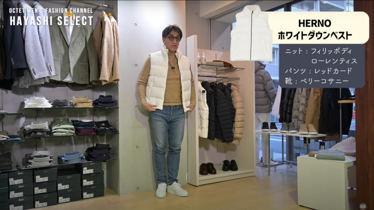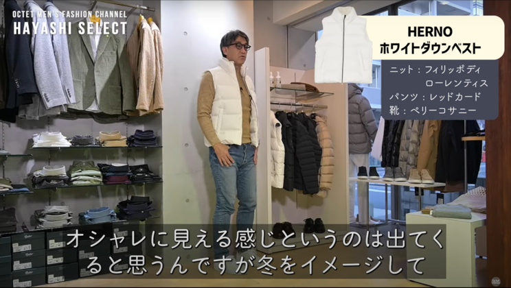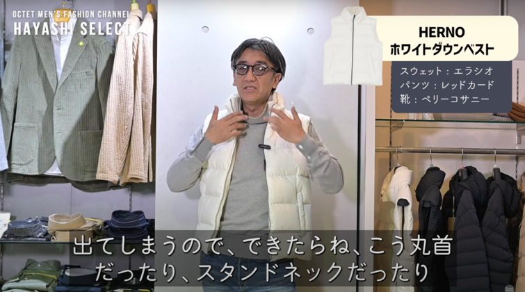 これぐらいのイメージで白のダウンベストを着ても、そんなに派手だなという印象はないと思いますので、ニットとダウンベストの組み合わせもすごくスマートだと思います。