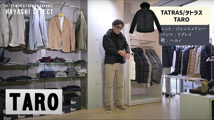 スウェット素材を使ったハイブリッドダウンやレイヤード調のダウンは、今年もたくさん種類が出ていると思いますが、こちらのタロ(TARO)モデルは毎シーズン、タトラス(TATRAS)でも人気があります。やはり非常に使い勝手が良いんですよね。