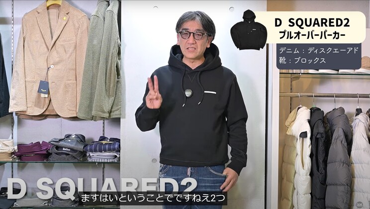 2つ目のコーディネートは、ディスクエアード(DSQUARED2)のダメージデニムとパーカーを組み合わせたスタイルです。
