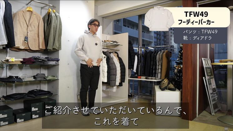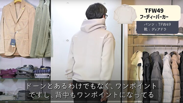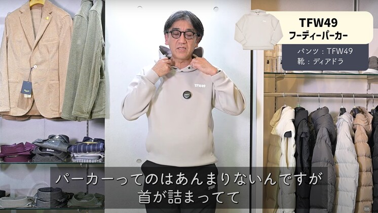 最後はTFW49(ティーエフダブリューフォーティーナイン)のセットアップではなく、パーカーとパンツのコンビネーションです。元々、TFW49はゴルフをテーマにしたブランドで、当店でもそのテーマに基づいて商品をご紹介していますので、このままゴルフに行くのにも適しているアイテムだと思います。