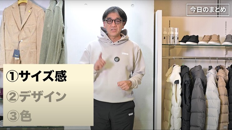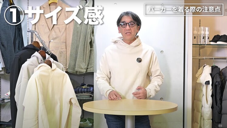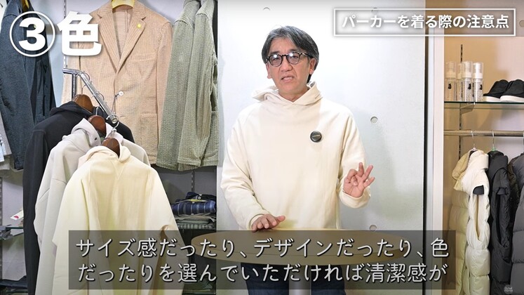 そして最後に、3つ目は色についてです。パーカーはカジュアルなアイテムということで、ビビッドな色が多くなりがちですが、ビビッドな色を選んでしまうと、どうしても若作りに見えたり、カジュアルになりすぎたりすることがあります。特に、40代50代60代の方で、ファッションにそこまで興味がないと思っている方には、パーカー選びの際にサイズ感やデザイン、色にも気を付けていただけると良いと思います。清潔感が、ミドル世代のファッション、いわゆる「イケオジ」にとっては非常に大切な要素ですので、そういったポイントを加味して着こなしていただければいいのではないかと僕は思っています。