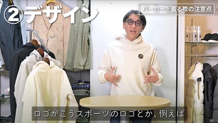 2つ目は、ロゴやデザインについてです。スポーツブランドのロゴや、可愛らしいデザインのプリントが施されたパーカーには、インパクトが強いロゴやデザインのものが多いため、気をつけた方が良いかと思います。もちろん、スポーツブランドを上手に着こなす方もいらっしゃいますし、実際に今日のコーディネートでも後ほど紹介しますが、アスレジャーとしてスポーツやゴルフに行く際にゴルフブランドを選ぶという着こなしもあります。しかし、一般的なタウンユースの場合、シンプルなデザインや無地ベースのものを選ぶ方がいいんじゃないかな、と僕は思っています。