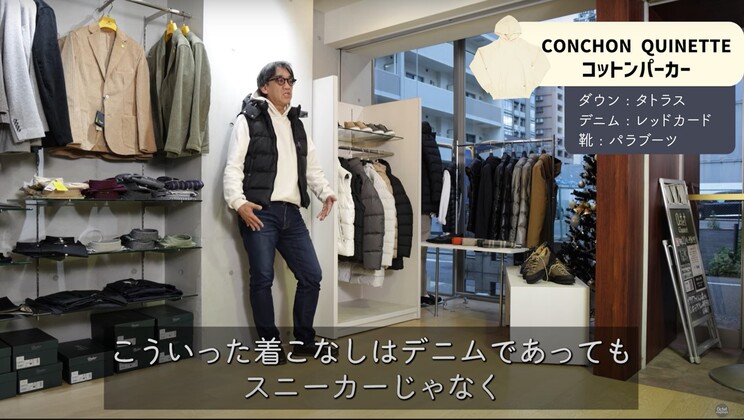 先ほども伝えたように、パーカーが少し大きめなものは別として、比較的スマートなものを選んでいただくことで、パンツも細身でフィット感のあるものを選ぶと、エレガントなコーディネートが完成します。まずは、明るめのベーシックなパーカーとダウンベストで、コーディネートを楽しんでいただければと思います。
