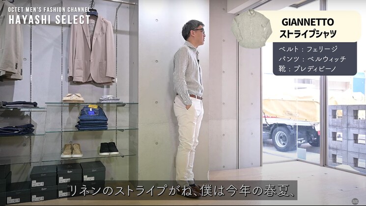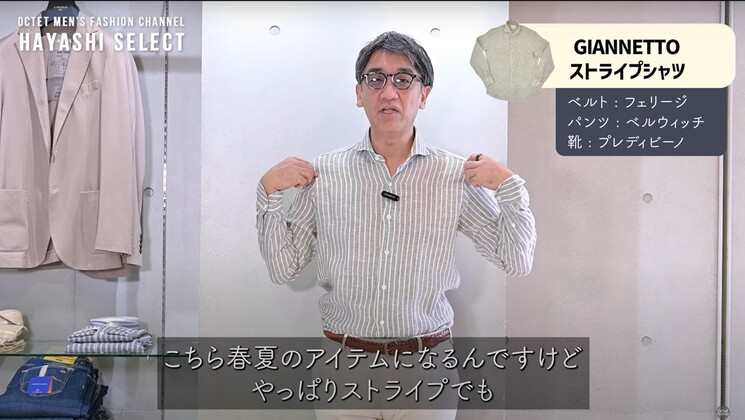 こちらは春夏向けのアイテムでジャンネット(GIANNETTO)のストライプシャツになります。特に、リネンのストライプは今年の春夏にすごくおすすめしたいと思っているんです。