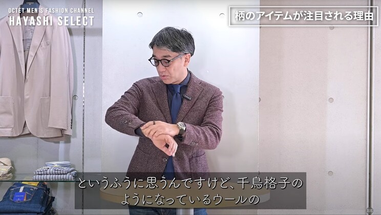 今日私が着ているのも柄物の一種で、千鳥格子のようなウールの柄ジャケットです。このジャケットは購入してから4~5年経っていますが、やはり柄物でも、派手すぎずインパクトが強すぎないものなので、たまに着る分には全く問題なく使えて、長く愛用できているんですよね。