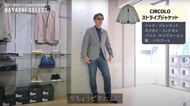 今はデニムにレザーシューズ、そしてネイビーonネイビーで、トーン・オン・トーンのコーディネートで、タイドアップネクタイをしています。こういった形でネクタイをしても大丈夫ですし、また、こちらのジャケットはチルコロ(CIRCOLO)のものですが、デニムの上に着ていただいても、このようにスマートに着こなしていただけると思います。